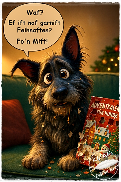 Dieses Motiv bringt frechen Humor direkt aus der Weihnachtsstube. Ein leicht überforderter Hund sitzt zwischen Krümeln, leerem Adventskalender und großen Augen voller Unschuld. Die witzige Sprechblase, warme Lichtstimmung und liebevolle Details machen dieses Bild zu einem echten Lacher für alle, die tierisches Weihnachtschaos nur zu gut kennen. Perfekt zum Schmunzeln, Sammeln und als kostenloser Download für Hundeliebhaber mit Humor.