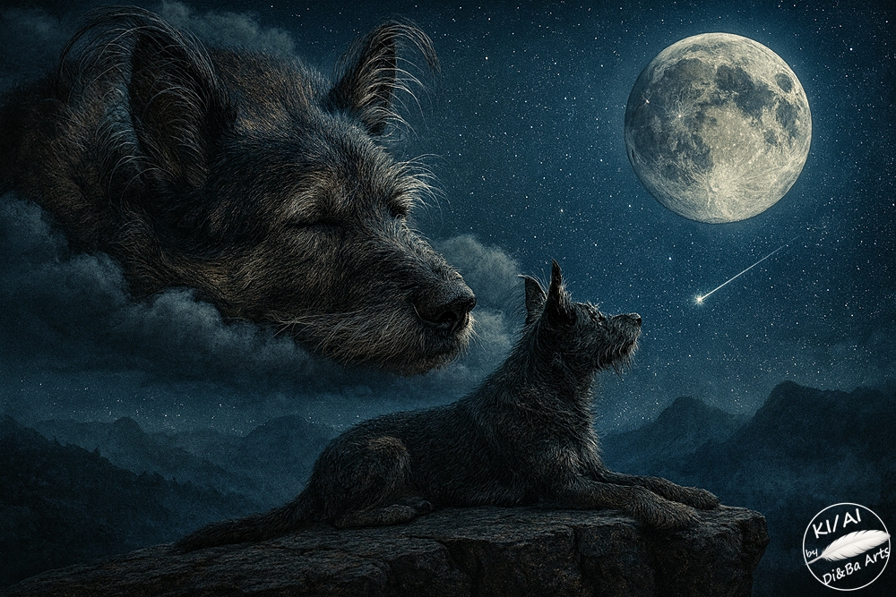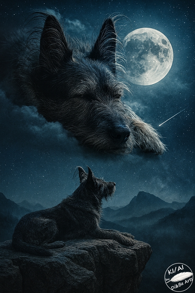 Ein Hund sitzt auf einem Felsen unter dem stillen Nachthimmel. Über ihm leuchtet der Vollmond und das friedliche Gesicht eines schlafenden Hundes erscheint in den Wolken. Diese poetische Szene erzählt von Liebe, Verlust und der unsichtbaren Verbindung zwischen zwei Seelen. Ein leises KI Kunstwerk voller Gefühl, Hoffnung und tiefer Verbundenheit.