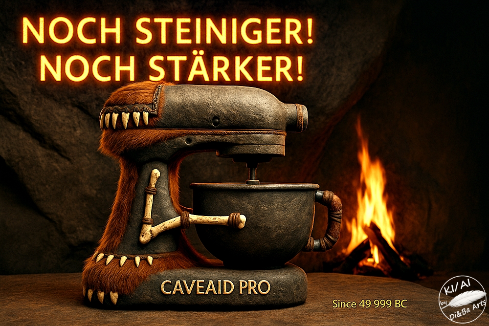 In einer steinzeitlichen Höhle steht die urtümliche Küchenmaschine „CaveAID Pro“. Komplett aus Fels, Knochen und Tierfell gefertigt, strahlt sie rohe Kraft und archaischen Humor aus. Im Hintergrund lodert ein Feuer, während die Worte „Noch steiniger! Noch stärker!“ in glühenden Lettern an der Felswand leuchten – ein augenzwinkerndes Werbemotiv aus der Urzeit.