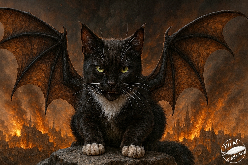 Eine schwarze Katze sitzt auf einem Felsen, ihr Blick ist fokussiert und durchdringend. Aus ihrem Rücken wachsen große, lederne Drachenflügel, die sich vor einem feurigen Hintergrund ausbreiten. Die Szene verbindet Stärke, Mystik und Fantasie zu einem eindrucksvollen Motiv.