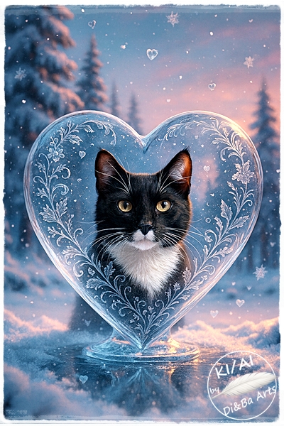 Dieses Motiv vereint Winterzauber und stille Emotion. Eine Katze blickt ruhig aus einem filigranen Eisherz, umgeben von sanften Schneeflocken und einer verträumten Winterlandschaft. Die Szene wirkt zart, liebevoll und fast märchenhaft und spricht Herz und Seele gleichermaßen an. Ein Bild für alle, die Winterromantik, Ruhe und besondere Katzenmotive lieben. Ideal zum Innehalten, Träumen und als kostenloser Download für echte Herzensmenschen.