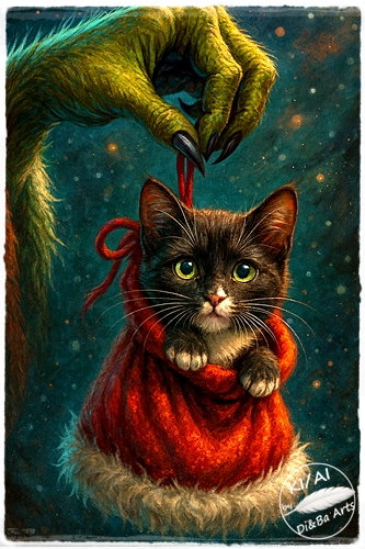 Dieses Bild spielt gekonnt mit Gegensätzen. Eine kleine Katze im roten Weihnachtsgewand blickt mit großen Augen in die Welt, während eine geheimnisvolle grüne Hand ihr sanft ein Band richtet. Zwischen Märchen, Magie und einem Hauch frechem Weihnachtschaos entsteht ein Motiv, das berührt, neugierig macht und sofort im Kopf bleibt. Perfekt für alle, die außergewöhnliche Weihnachtsbilder lieben und sich einen kostenlosen Download mit Charakter sichern möchten.
