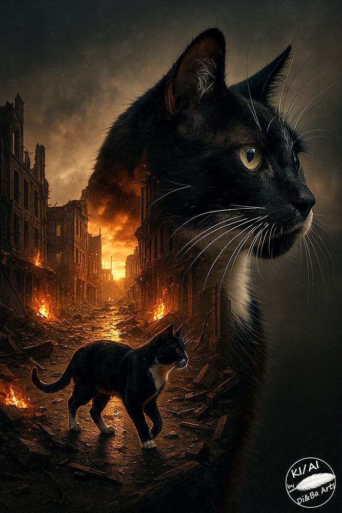 EEine schwarz weiße Katze steht in einer zerstörten Straße, umgeben von Flammen und Rauch. Über ihr erscheint ihr eigenes, riesiges Abbild im Himmel, ruhig und entschlossen. Das Motiv verbindet Zerstörung und Stärke zu einer eindrucksvollen, filmreifen Szene.