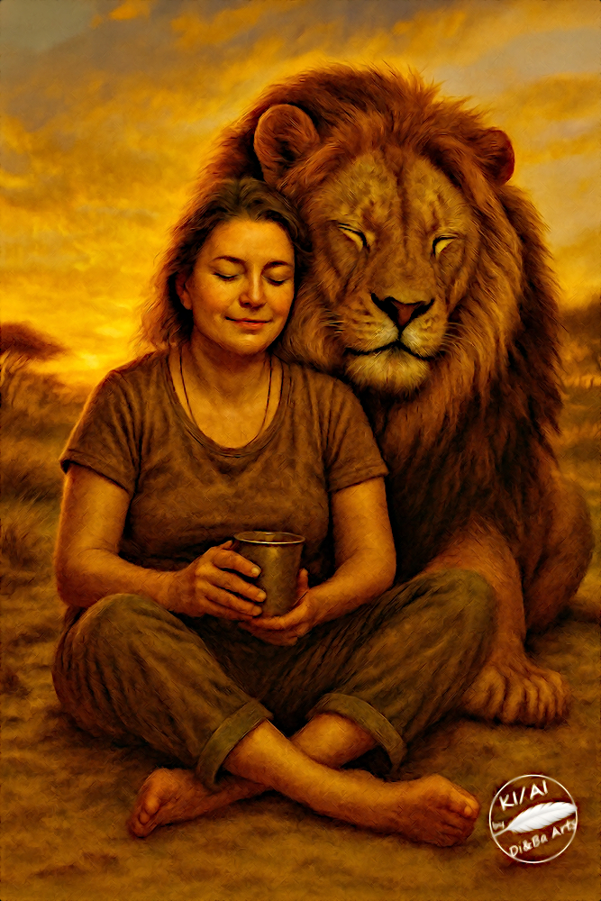 Eine Frau sitzt entspannt im warmen Abendlicht, die Augen geschlossen, eine Tasse in der Hand. Neben ihr lehnt sich ein friedlicher Löwe mit geschlossenen Augen an sie, beide wirken vollkommen ruhig und vertraut. Eine sanfte, emotionale Szene voller Harmonie.