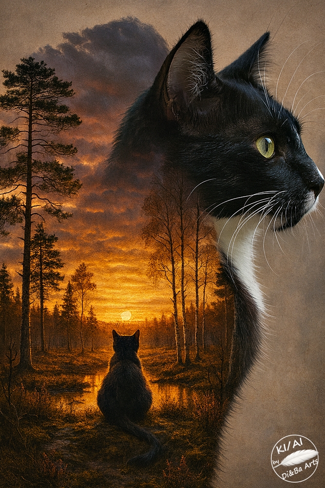 Eine Katze sitzt im warmen Licht des Sonnenuntergangs am Rand eines stillen Moores. Ihre Silhouette spiegelt sich im goldenen Wasser, während im Vordergrund ihr sanftes Porträt erscheint, als würde sie über sich selbst und das Leben wachen. Diese Szene erzählt von Ruhe, Erinnerung und der stillen Verbindung zwischen Seele und Natur. Ein gefühlvolles KI Kunstwerk voller Tiefe und Harmonie.