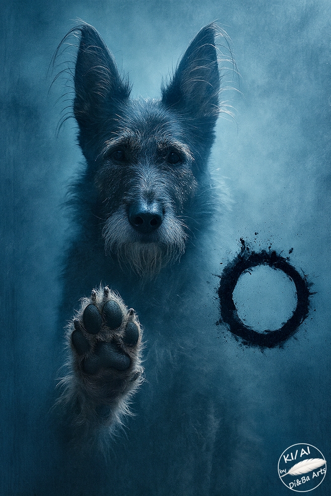 Ein Hund steht im dichten Nebel und presst seine Pfote gegen eine Glasfläche. Neben ihm ist ein dunkler Kreis zu sehen, als wäre dort ein Zeichen oder Abdruck entstanden. Das Bild wirkt mystisch, ruhig und geheimnisvoll. Eine Szene voller Andeutung und Tiefe.