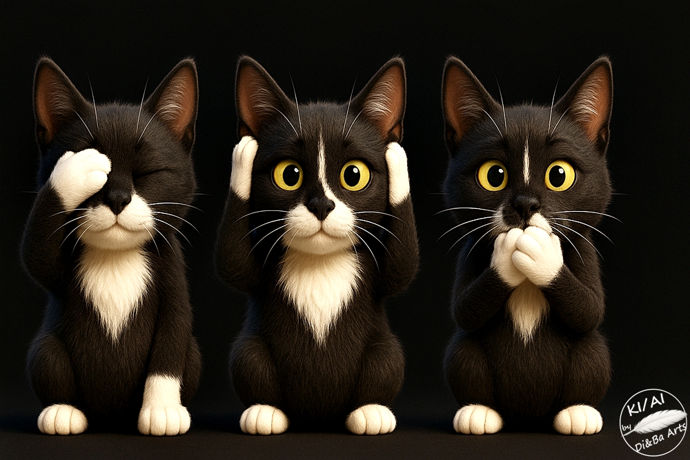 Drei kleine schwarz weiße Katzen sitzen nebeneinander auf dunklem Hintergrund. Die erste hält sich die Augen zu, die zweite die Ohren, die dritte das Maul. Ihre großen gelben Augen und das weiche Fell verleihen der Szene einen charmanten, verspielten Ausdruck. Eine liebevolle KI Darstellung des bekannten Motivs nichts sehen nichts hören nichts sagen in flauschiger Katzenversion.