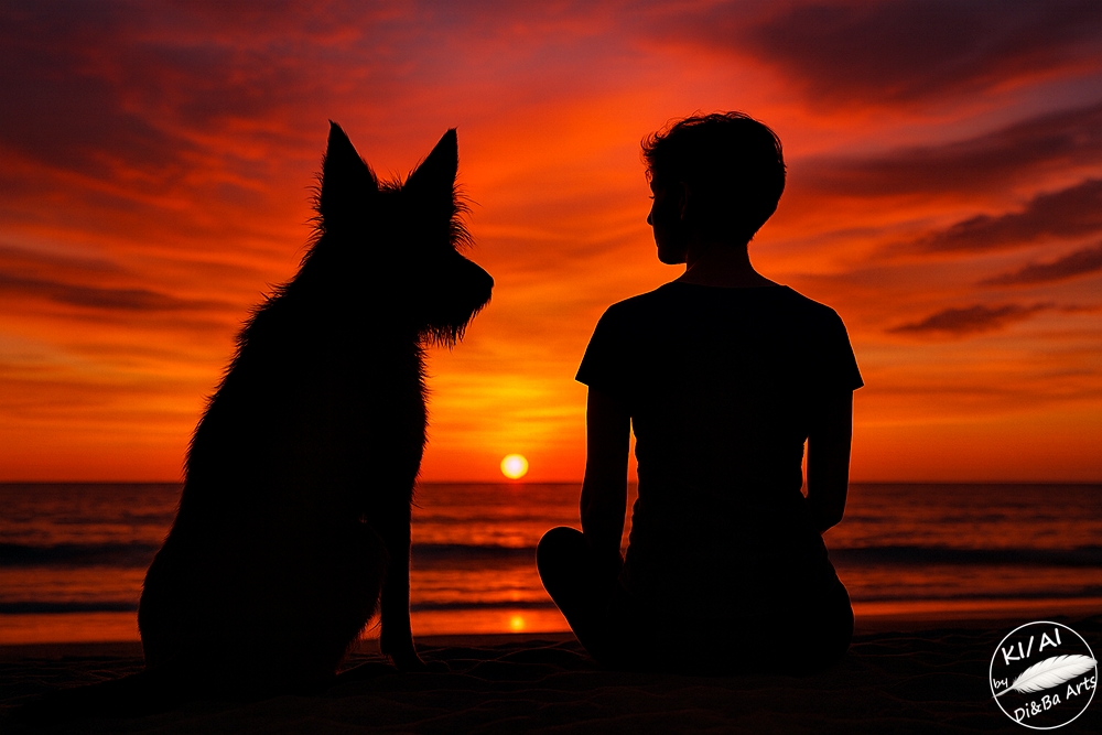 Ein Mensch und ein Hund sitzen Seite an Seite am Strand und blicken in den leuchtenden Sonnenuntergang. Die beiden Silhouetten zeichnen sich klar vor dem intensiven Rot-Orange des Himmels ab. Ein Moment stiller Freundschaft, Frieden und gegenseitigen Vertrauens.
