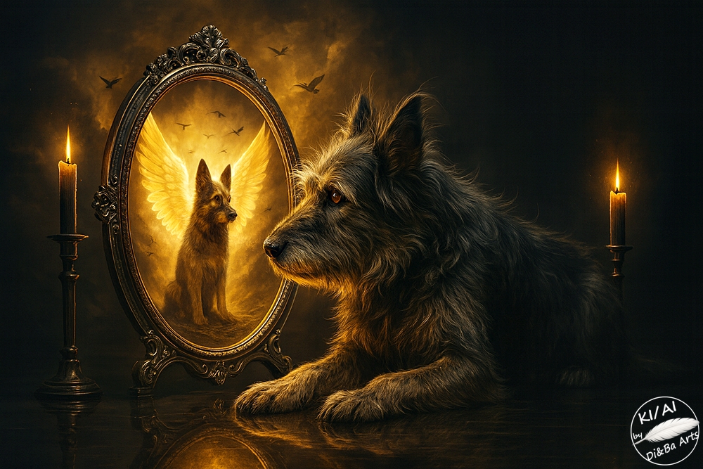 Ein Hund blickt in einen alten, kunstvoll verzierten Spiegel. Im Spiegelbild erscheint er mit leuchtenden Engelsflügeln, umgeben von goldenem Licht und fliegenden Vögeln. Zwei Kerzen erhellen die Szene, die Ruhe, Spiritualität und den Gedanken an eine andere Welt ausstrahlt.