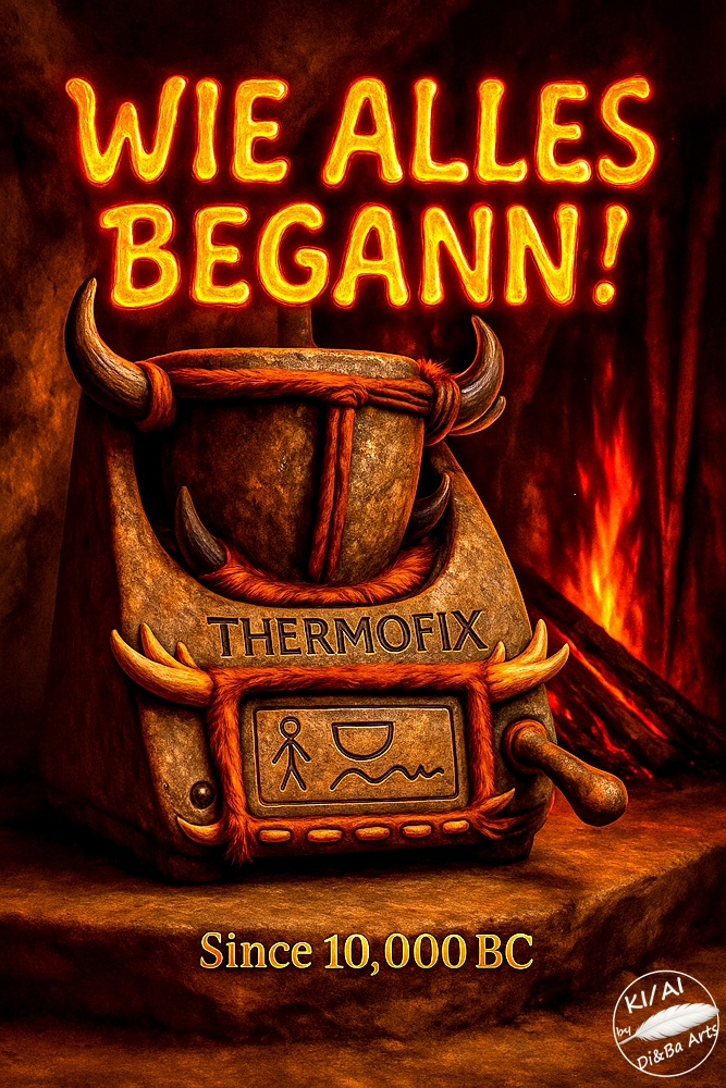In einer steinzeitlichen Höhle steht das legendäre Gerät Thermofix, gefertigt aus Stein, Seilen und Hörnern. Über dem prähistorischen Küchenhelfer leuchtet der Schriftzug Wie alles begann in feurigem Orange. Das Feuer im Hintergrund taucht die Szene in warmes Licht und verleiht ihr eine mythische Atmosphäre. Ein humorvolles KI Kunstwerk über die Anfänge der Kochkunst und den erfinderischen Geist der Urzeit.