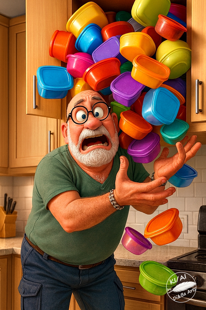 Ein Mann steht entsetzt in seiner Küche, während ihm ein ganzer Schrank voller bunter Tupperdosen entgegenfällt. Seine weit aufgerissenen Augen und die hilflos ausgestreckten Arme fangen den Moment purer Panik perfekt ein. Überall fliegen leuchtende Dosen in Rot, Blau, Grün und Gelb. Ein humorvolles KI Kunstwerk, das das tägliche Küchenchaos mit viel Witz und Farbe einfängt.