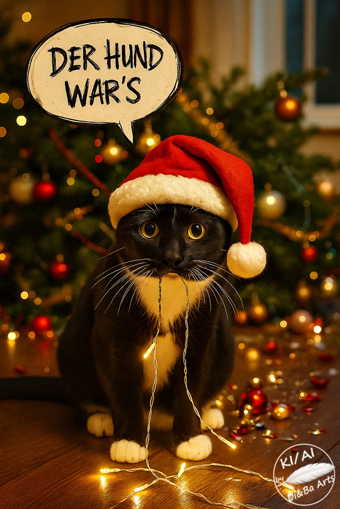 Eine schwarze Katze mit weißen Pfoten sitzt vor einem weihnachtlich geschmückten Hintergrund. Sie trägt eine Santa-Mütze und hat eine zerkaute Lichterkette im Maul. Über ihr erscheint eine Sprechblase mit dem Text „Der Hund war’s“. Die Szene ist warm beleuchtet, humorvoll und weihnachtlich-chaotisch.