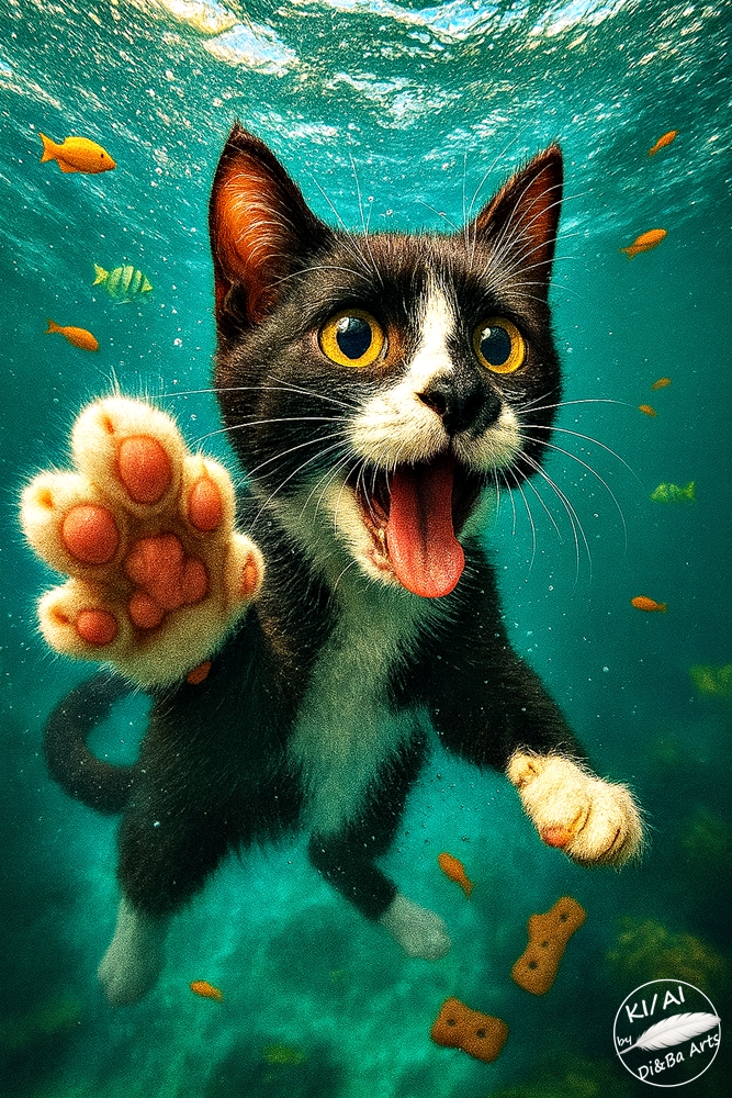 Eine schwarz-weiße Katze taucht fröhlich durchs Wasser, die Pfoten weit ausgestreckt, das Maul offen vor Begeisterung. Zwischen bunten Fischen und treibenden Leckerlis jagt sie ihrer ganz eigenen „Beute“ hinterher. Das spritzige Motiv verbindet Humor, Dynamik und den Charme einer Katze, die eindeutig nicht wasserscheu ist.