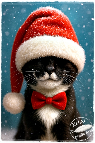 Dieses Motiv lebt von stiller Eleganz und einem Augenzwinkern. Eine schwarz weiße Katze mit tief ins Gesicht gezogener Weihnachtsmütze und roter Fliege steht für puren Festtagscharme ohne Kitsch. Schneeflocken, ruhige Farben und der selbstbewusste Ausdruck machen dieses Bild zu einem perfekten Hingucker für alle, die Weihnachten lieber stilvoll als laut mögen. Ideal zum Sammeln, Dekorieren und als kostenloser Download für echte Katzen und Weihnachtsfans.