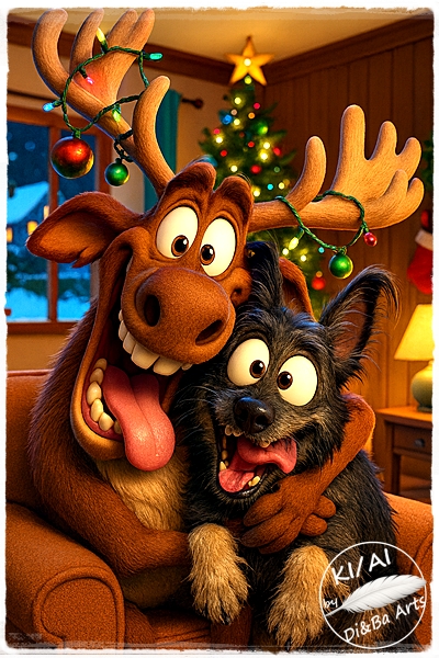 Dieses Motiv steht für pure Weihnachtsnähe und tierische Freundschaft. Ein fröhlicher Elch und ein glücklicher Hund kuscheln lachend auf dem Sofa, umgeben von warmem Licht, geschmücktem Weihnachtsbaum und gemütlicher Wohnzimmerstimmung. Humor, Herzlichkeit und festliche Details verschmelzen zu einem Bild, das sofort Wärme ausstrahlt und ein Lächeln schenkt. Perfekt für alle, die Weihnachten am liebsten gemeinsam, lustig und entspannt feiern. Ideal zum Sammeln, Teilen und als kostenloser Download.