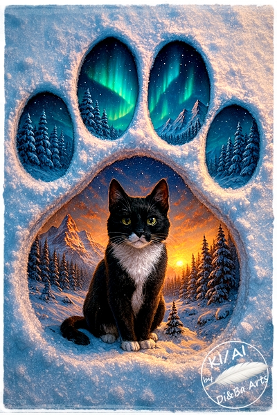 Dieses Motiv verbindet Wintermagie mit einem Hauch Fantasie. Eine Katze sitzt ruhig in einer großen, schneebedeckten Pfotenform, in deren Innerem sich eine leuchtende Winterlandschaft entfaltet. Nordlichtfarben, warme Lichtakzente und klare Konturen schaffen eine Szene, die gleichzeitig kraftvoll und ruhig wirkt. Ein Bild für alle, die Tiere, Winter und märchenhafte Motive lieben. Ideal zum Träumen, Sammeln und als kostenloser Download für besondere Wintermomente.